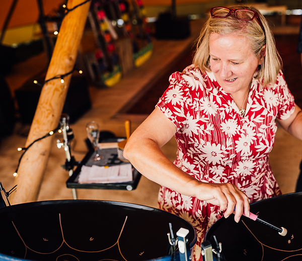 On the double alto pans, Julie has the widest range of notes in the ensemble. Whilst she helps carry the rhythm, she also plays recurring riffs and takes the melody when a piece is set in a lower register.